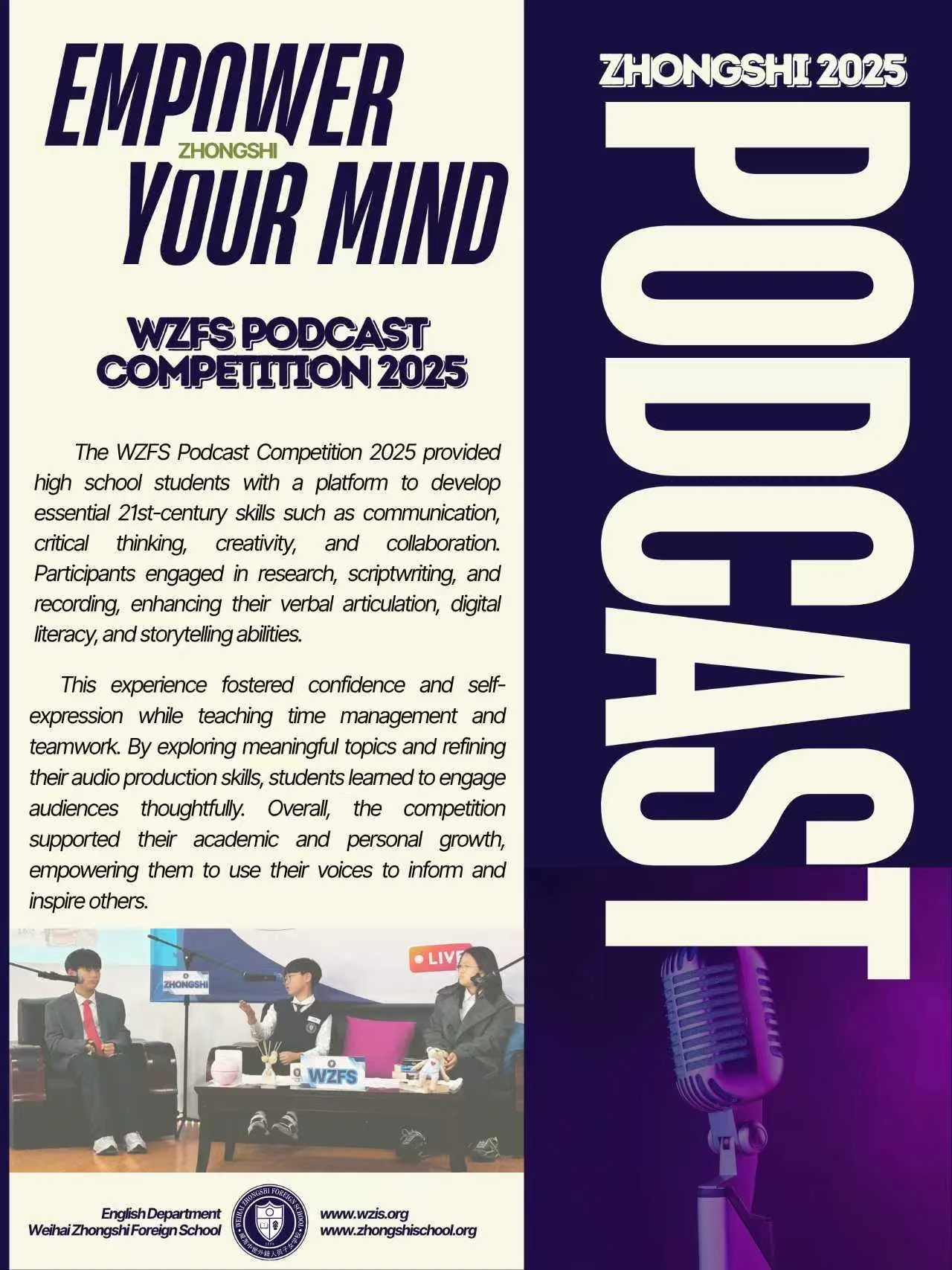 At Weihai Zhongshi Foreign School, innovation and creativity go hand in hand with learning. This year’s WZFS Podcast Competition 2025 gave our high school students a powerful platform to explore their voices, ideas, and passions in a modern and meaningful way.